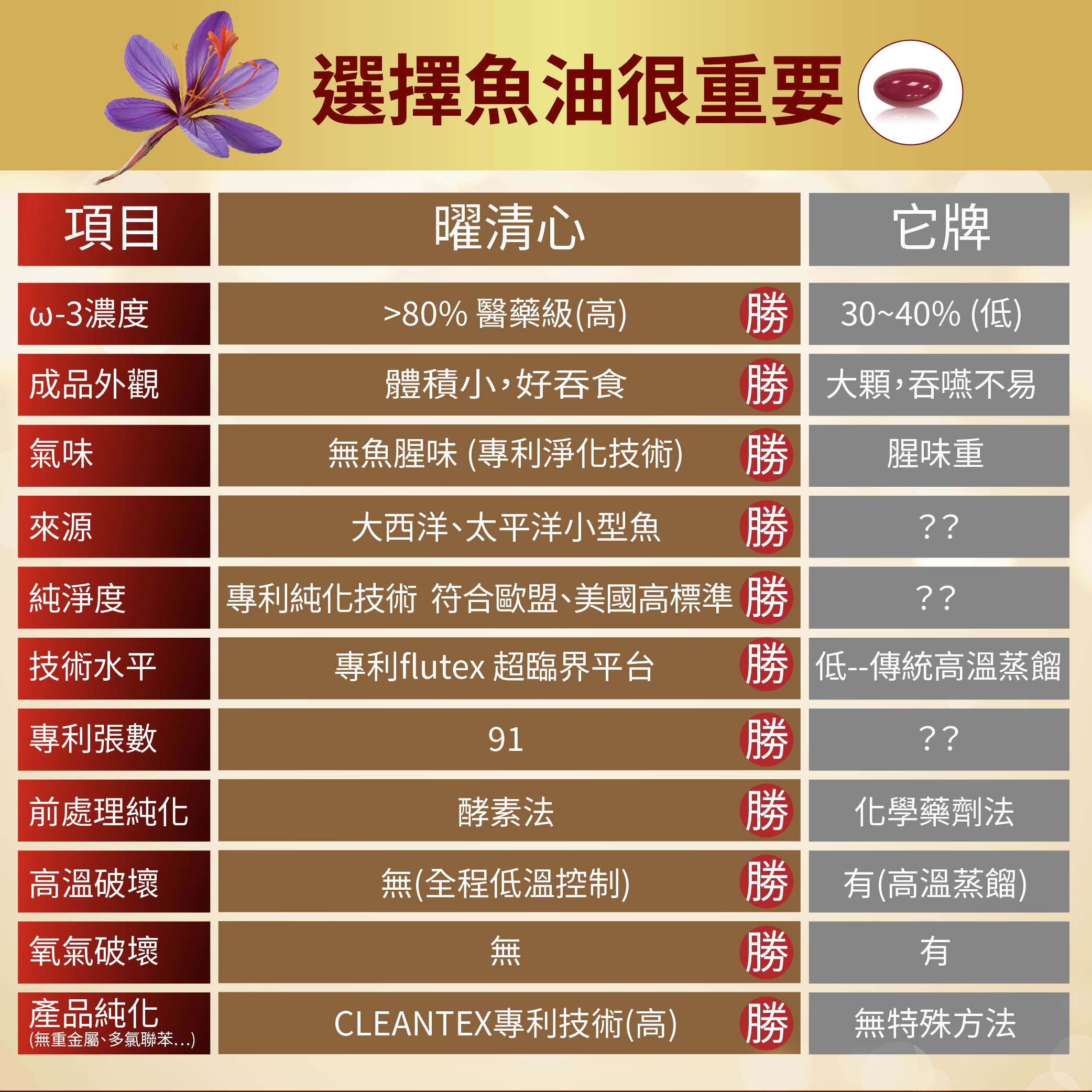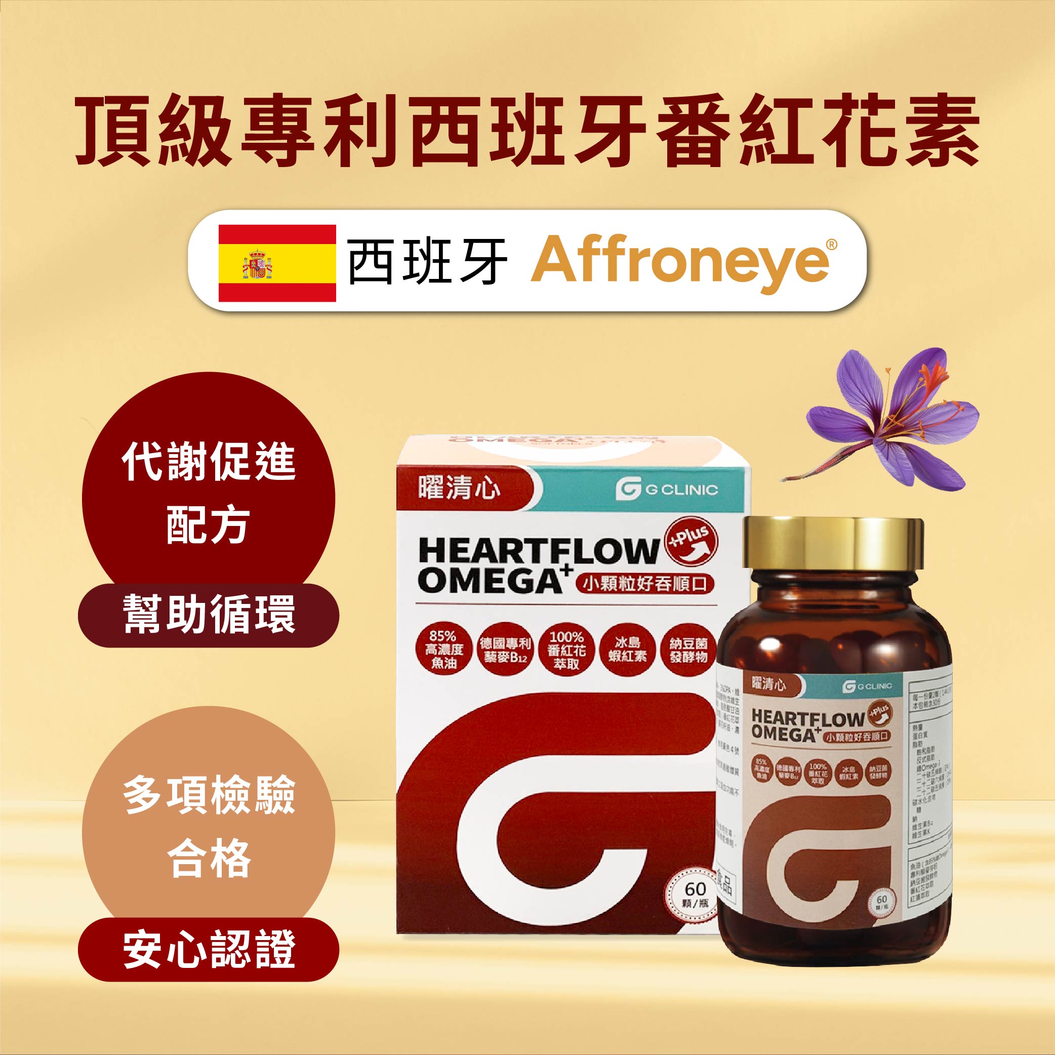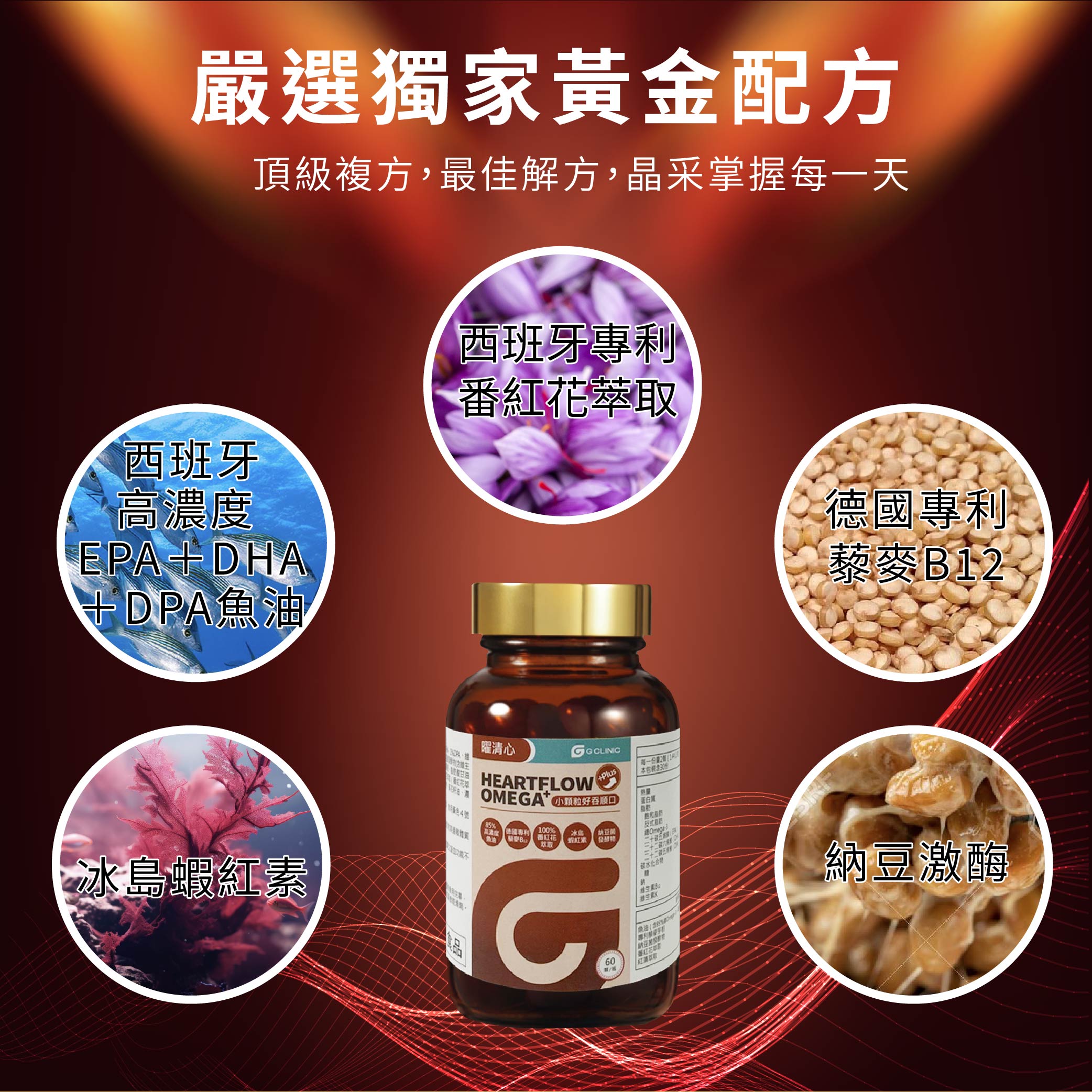 Contents: Fish oil [containing 85% total Omega-3, 48% EPA, 32% DHA, 1% DPA, Vitamin E (antioxidant)], patented quinoa germ powder (containing Vitamin B12), fermented natto (containing Vitamin K2) [corn starch, soybean oil, sodium casein, sodium octenyl succinate starch, fatty acid glycerides, Vitamin K2 (fermented natto)], fatty acid glycerides, saffron extract (saffron extract, dextrin), red algae extract (containing astaxanthin) [Haematococcus pluvialis extract, sunflower seed oil, concentrated d-α-tocopherol (antioxidant)], soy lecithin.